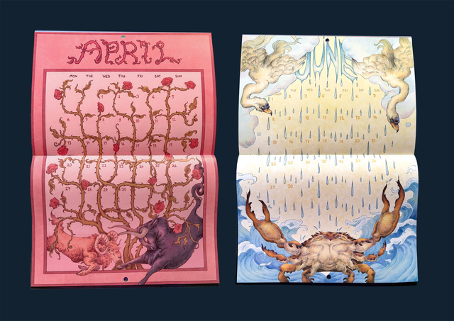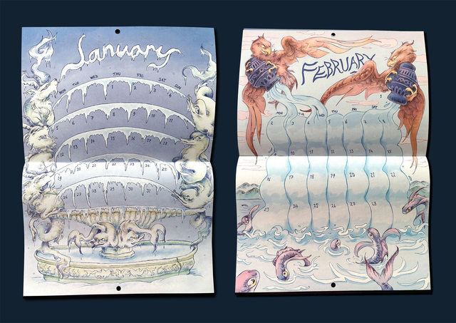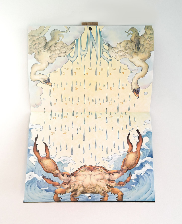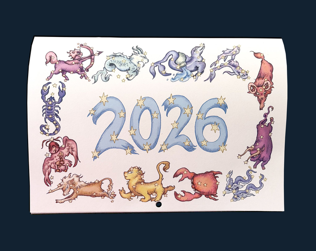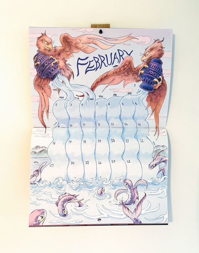 A fully illustrated wall calendar for 2026 that's based on the Zodiac signs. When opened it's A3 sized (29,7×42 cm) and when closed A4 (21x29,7 cm). Please note that the colors differ a bit on screen than on person. The calendar is stapled and has a hanging hole. The cover paper is 250 gsm matte paper and the inside is 120 gsm matte paper (you can write on it with a pencil).