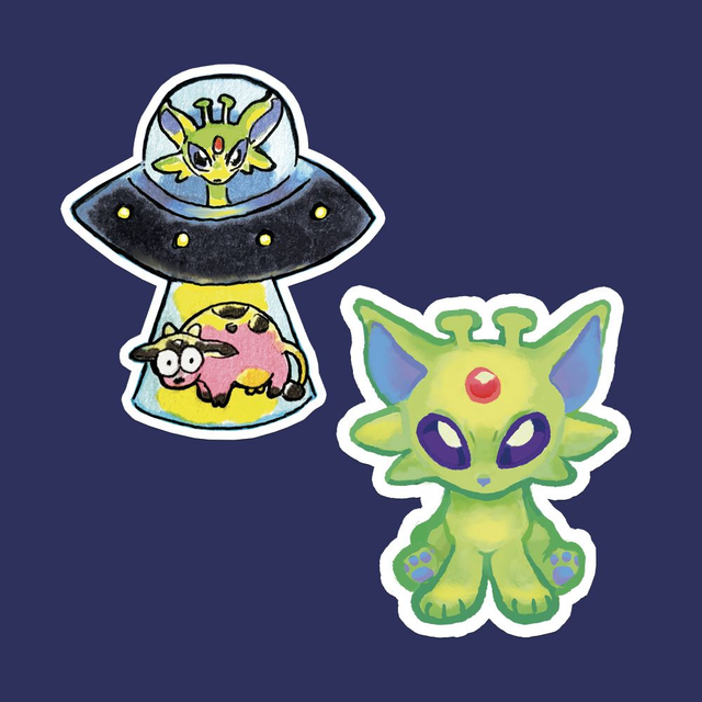 Matte vinyl stickers, "Alien Espeon abducting Milktank" sticker's height is about 7 cm and "Sitting Alien Espeon" sticker's height is about 6,4 cm.
