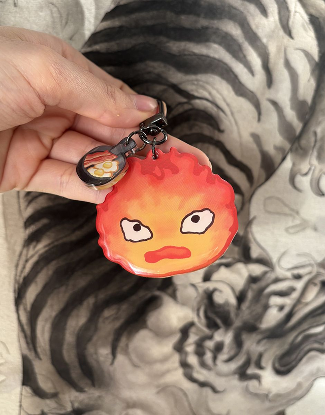 A two-pieced acrylic charm of Calcifer with a pan on top of him. Calcifer's width is 5,5 cm and the pan's height about 3 cm.