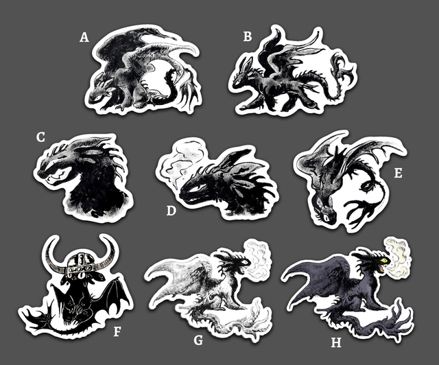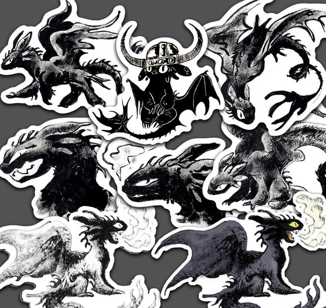 HTTYD Vinyl stickers of my inked Toothless artworks. The dimensions of each sticker (sticker's longest side):