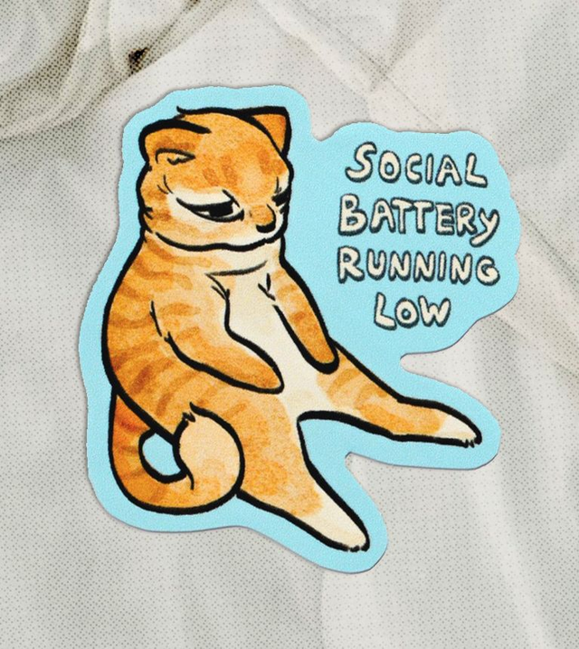 A matte vinyl sticker. Height is about 6,2 cm. Available also without the text, check "Tired cat vinyl sticker" in the products.