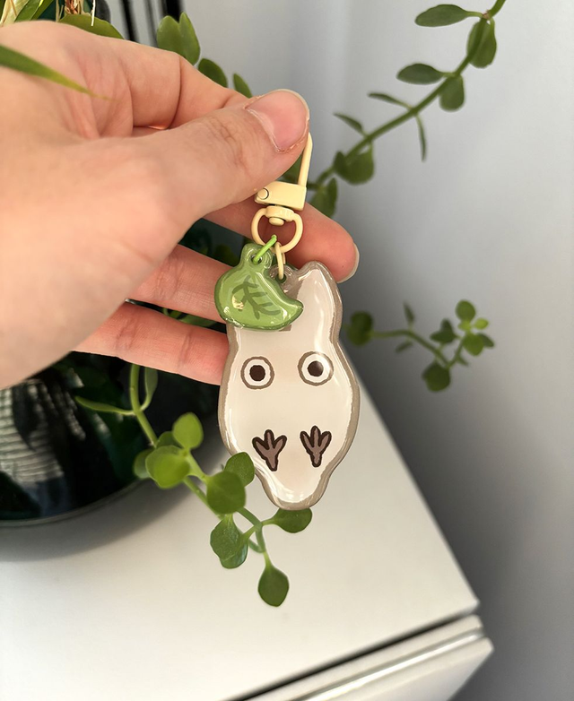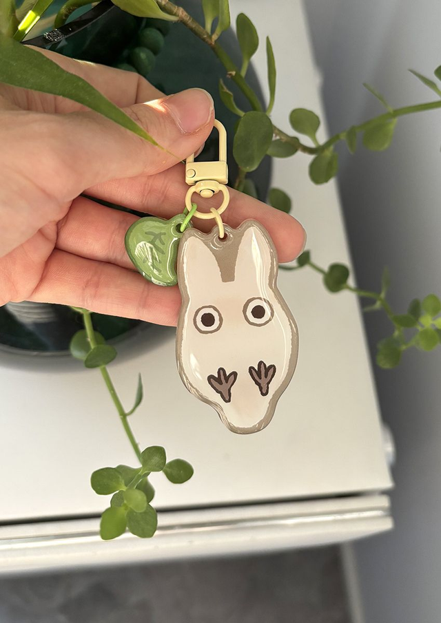 A two-pieced acrylic charm of the small white Totoro. Totoro's height is 6,4 cm and the leaf's width about 2 cm.